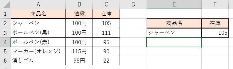 商品名(E3)を入力すると在庫数がでてくるようにします。