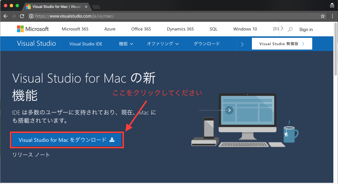 マイクロソフト公式ページの、Mac用VisualStudioのダウンロードページ