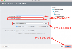 VisualStudioによる、HelloWorldの新規プロジェクトの作成画面