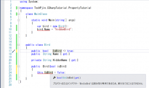 例えば、以下の例では、メインクラスから、外部のBirdクラスのHiddenNameに値を設定しようとしましたが、