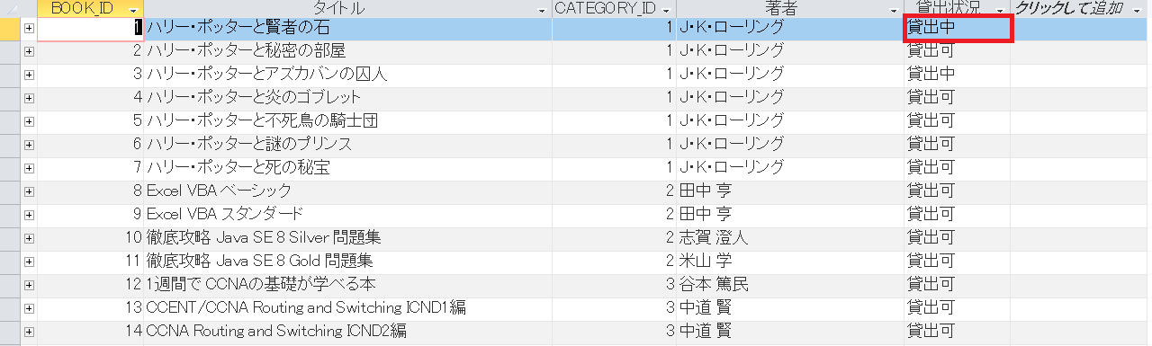 ‘ 「蔵書一覧」テーブルの貸出状況を「貸出可」に変更